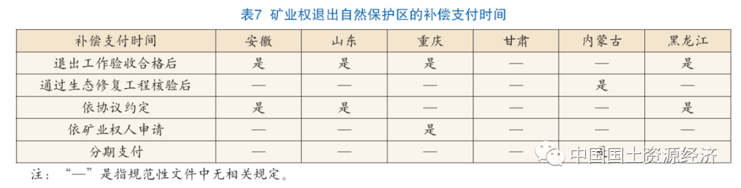 在补偿支付时间上(表7),安徽、山东、黑龙江三省规定在退出工作验收合格后,依据协议约定的时间向矿业权人支付补偿;重庆市规定在退出工作验收合格后,依据矿业权人申请支付补偿;内蒙古自治区规定在通过生态修复工程核验后支付补偿,并增加了分期支付的规定。甘肃省未对补偿支付时间作出明确规定。
