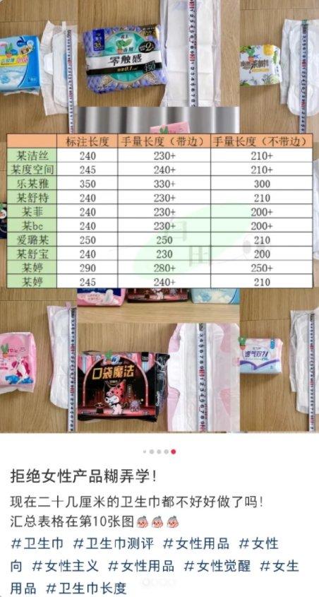在社交平台上有不少女性测评卫生巾,例如卫生巾的长度、吸水倍率等,虽然手工测量有差距,但是可以看出,有些品牌的卫生巾确实可能不达标。不过,在测量的时候也需要按照国家标准。