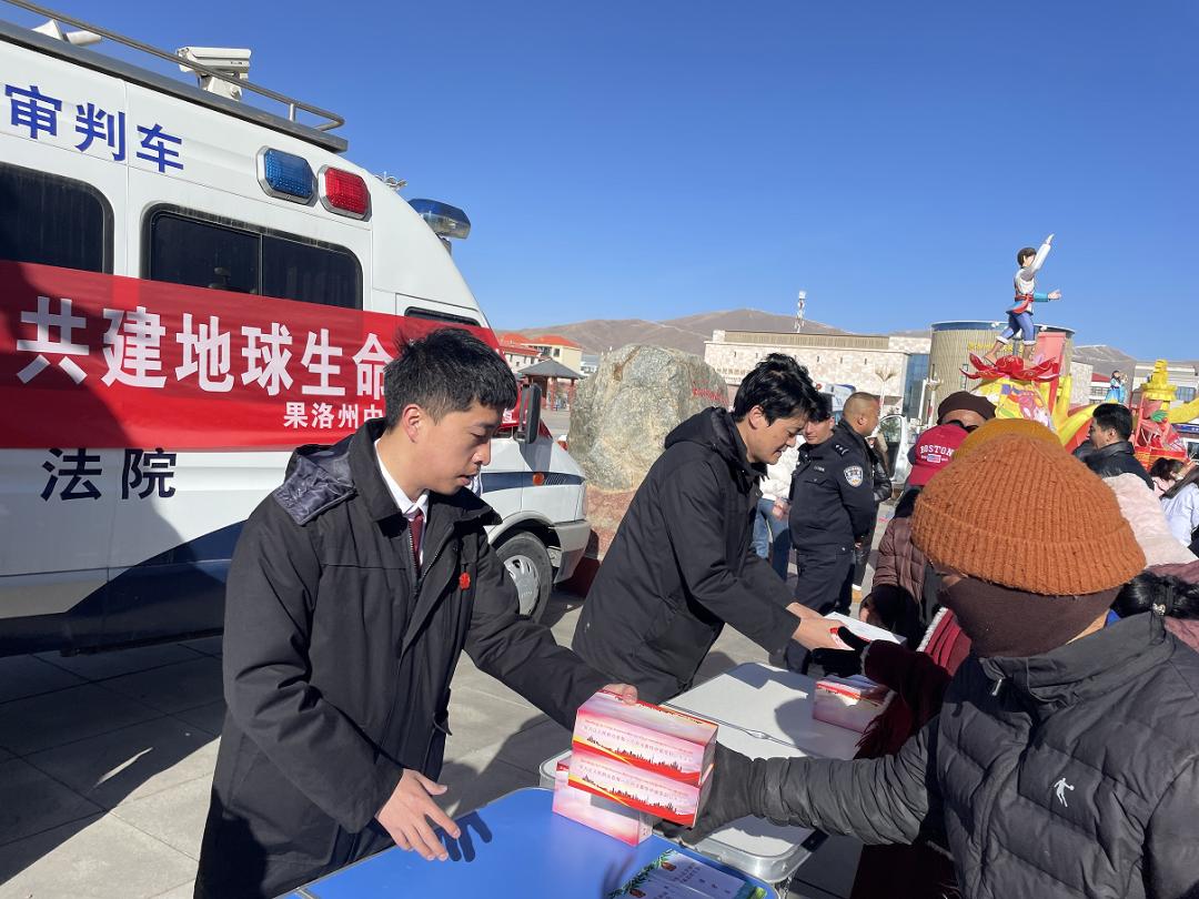 蔚蓝的天空下,果洛中院干警在格萨尔广场以案释法,重点讲解了玛沁法院审结的马某赛、马某全危害珍贵、濒危野生动物刑事附带民事公益诉讼一案。2023年12月初,被告人马某赛、马某全以放牧为名,采购捕兽夹相约前往雪山乡,行非法猎杀野生动物之实。经司法鉴定,二人所猎动物系马麝,属国家一级保护动物,其价值为30000元人民币。经审理,对二被告人判处了有期徒刑并处相应罚金。干警用藏汉双语强调了破坏野生动植物资源的法律后果,牧民群众对保护生物多样性的重要性有了深刻认识。
