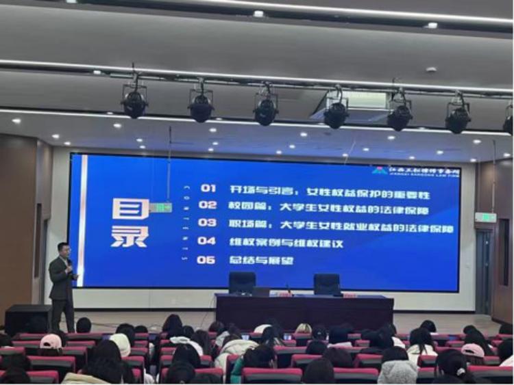 抚州市妇女儿童维权法律服务站负责人吴海兵律师走进赣东学院,以“大学生女性权益保护专题——从象牙塔到写字楼的法律盾牌”为题,用生动的语言、真实的案例为女大学生讲解宪法、民法典和妇女权益保障法等法律知识,引导学生学法、用法,依法维护自身合法权益。