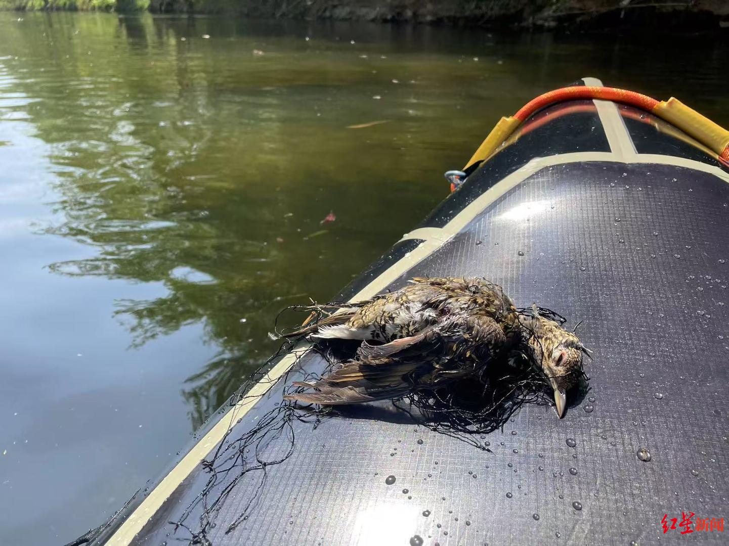 游客岚先生也告诉红星新闻记者,他上周日也在此看到了网阵,不过数量更多,有2道。当时,其中一道网上缠着一只活着的绿头鸭。“我们把鸟救下来了,拆掉了其中一只网,周一又去拆了一只。”岚先生说。