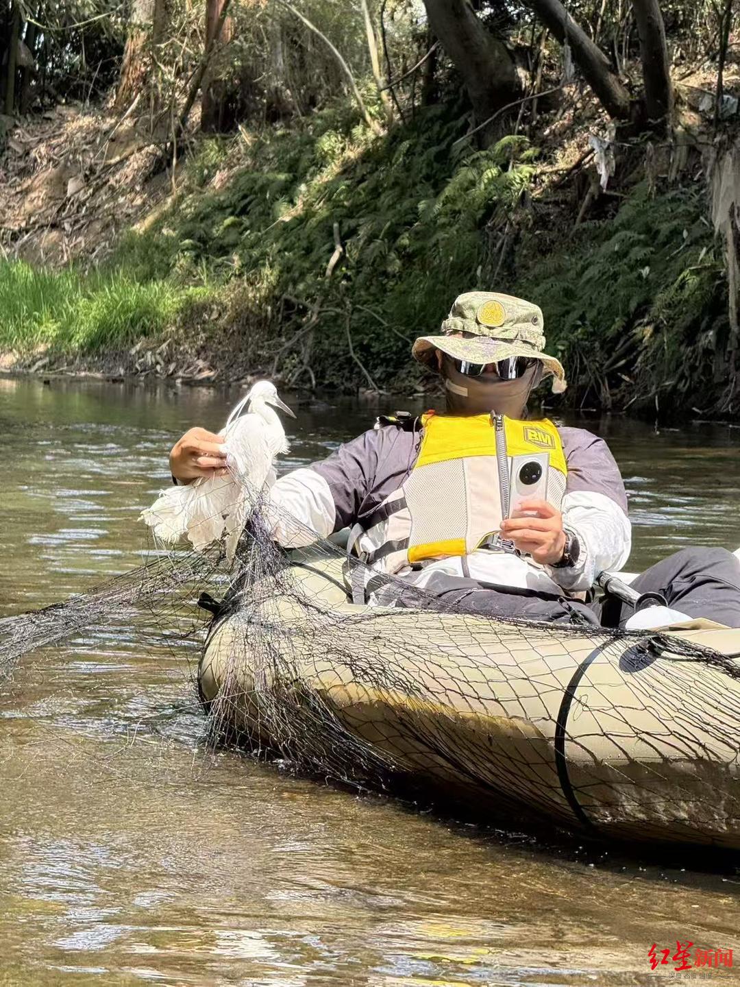 刘磊是成都mrs背包船俱乐部成员,26日在成都天府新区靠近科学城南路的鹿溪河段划船时,无意间看到了河道上方密布的捕鸟网,网上挂着的鸟类更是让他心惊:一只活着的白鹭在扑腾挣扎,另一只灰黑色的虎斑地鸫则呈奄奄一息状。