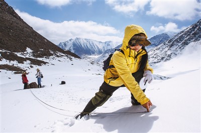 图为4月29日,科研人员观测新疆天山一号冰川西支的退缩程度。岑云鹏摄(新华社发)