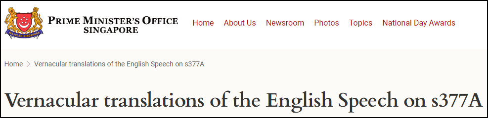 新加坡总理办公室网站专门翻译了关于第377A节条文的内容