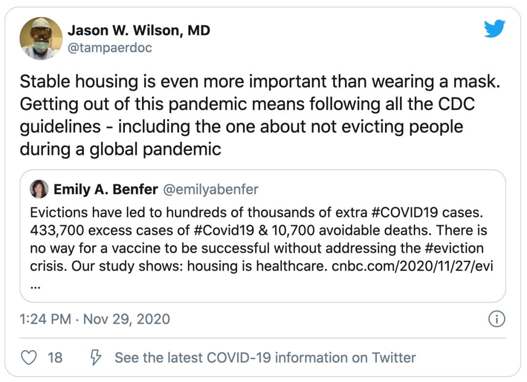 人类医学家Jason Wilson发推特说:“稳定的住房比戴口罩重要。”