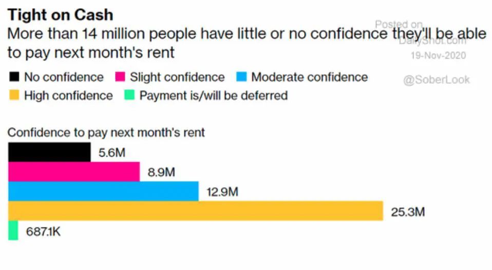 美国统计局(U.S Census Bureau)的数据也证明了禁令的必要性。从10月28日到11月9日,“完全没信心付得起房租”的人数从44万飙升到6万。