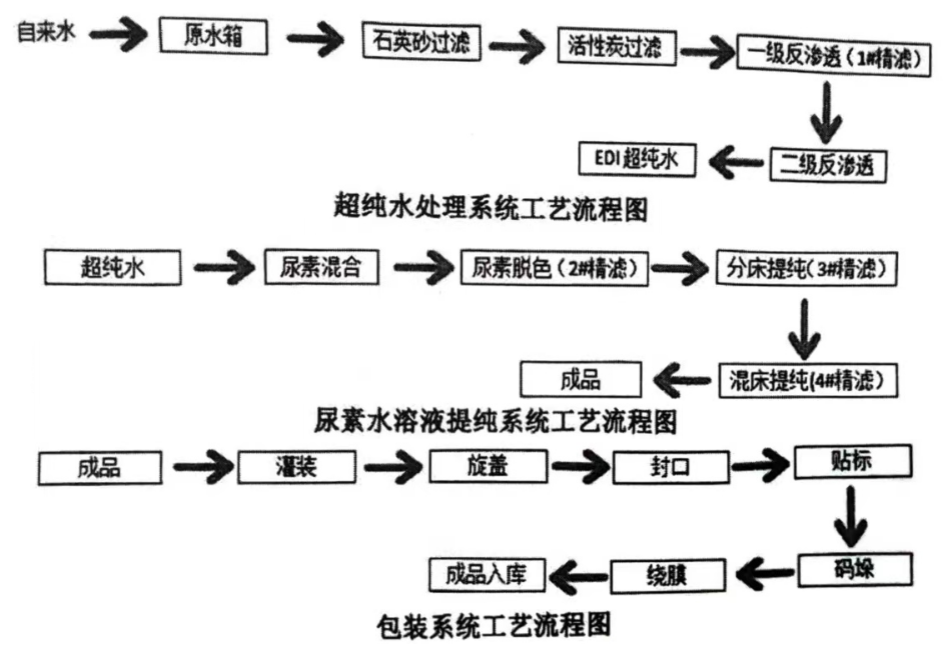 2.事故车间工艺情况尿素混合车间主要生产车用尿素水溶液,工艺为通过自来水制取超纯水,然后将超纯水和尿素固体按比例混合形成尿素水溶液,再经过脱色、提纯等精滤步骤后形成尿素水溶液成品(见图3)。该生产过程为纯物理混合溶解,不涉及化学反应,不产生剧毒化学物质。