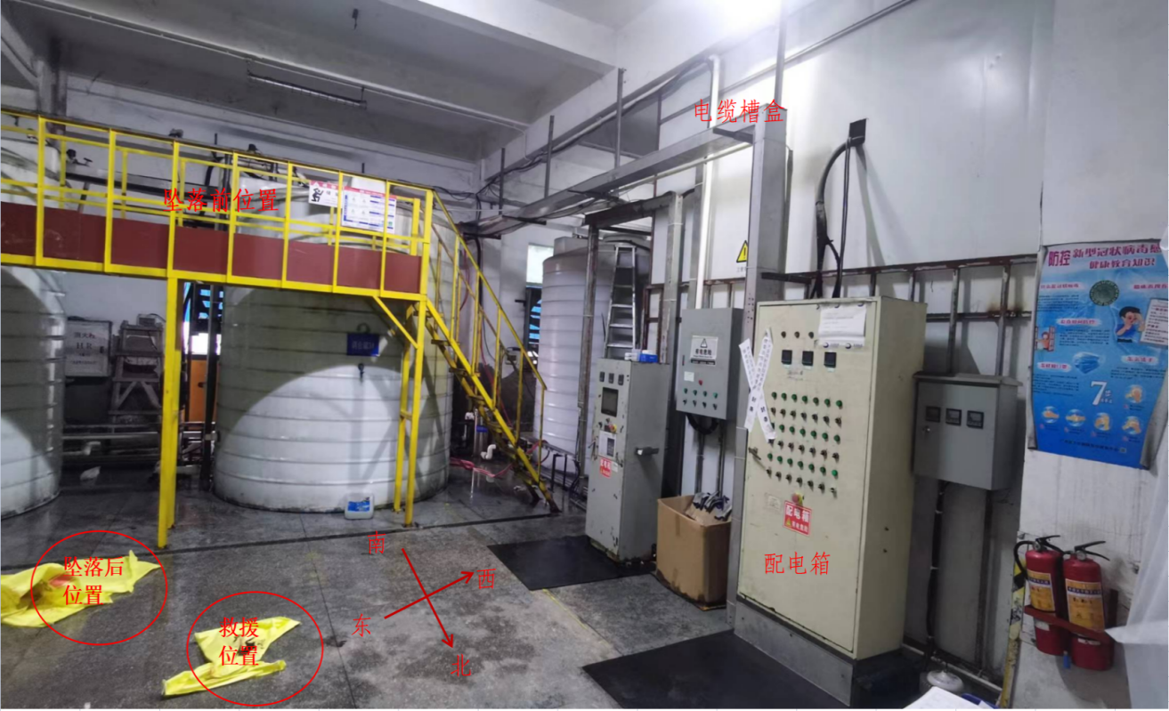 3.事故车间装置情况惠州市加泽科技有限公司尿素混合车间共设置有3个调合罐,自东向西依次为1#、2#、3#,调合罐为PE材质立式罐,直径为2.6m,高度3.1m,储罐北侧设置有铁质操作平台。1#调合罐东侧和2#、3#调合罐北侧各设置一个尿素上料平台。尿素混合车间西侧地面自南向北依次设置有一个控制箱、一个配电箱,上方有设置电缆线槽(见图4)。
