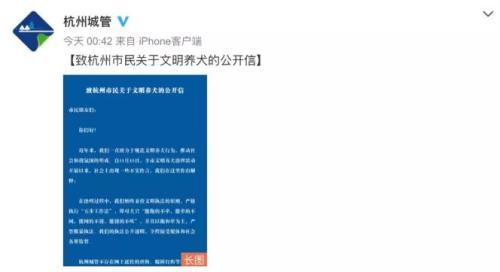 17日凌晨,杭州城管官方发布《致杭州市民关于文明养犬的公开信》,信中表示,本次治理工作的重点是不按规定养犬的人,而不是犬。公开信指出,杭州城管不存在网上谣传的虐狗、棍棒打狗等暴力行为,并重申,本次治理工作的重点是针对出户不系犬绳、不清理狗粪便等不文明养犬的行为,处罚的重点是不按规定养犬的行为人,而不是犬本身。