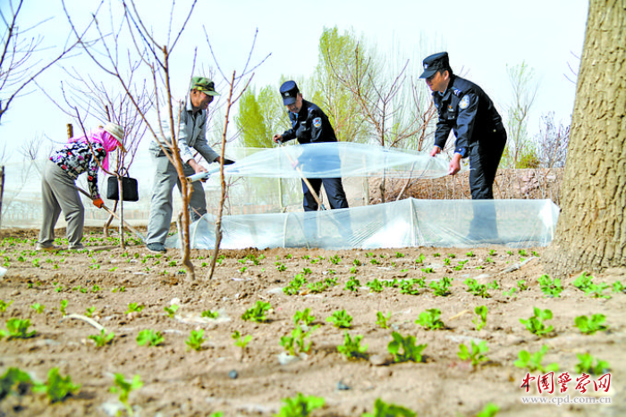 近日,甘肃省临泽县公安局沙河派出所“田间警务服务队”民警辅警走进田间地头,帮助群众拉薄膜、搭菜棚。安学海 摄