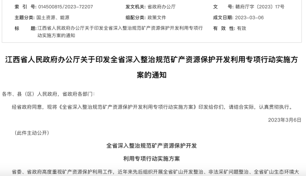 在此次《实施方案》中,江西省政府称,“通过集中整治矿产资源特别是钨、稀土、锂等保护性、战略性矿产资源开发利用秩序,使得无证勘查开采、乱采滥挖、浪费矿产资源、破坏生态环境、非法占用耕地林地和自然保护地等违法行为,以及以环境治理、矿山修复、土地整理、工程施工等名义违法采矿行为得到有效遏制;非法转让矿业权、以采代探、圈而不探和越界开采等违法行为得到查处,全省依法办矿、依法管矿意识得到进一步增强。”