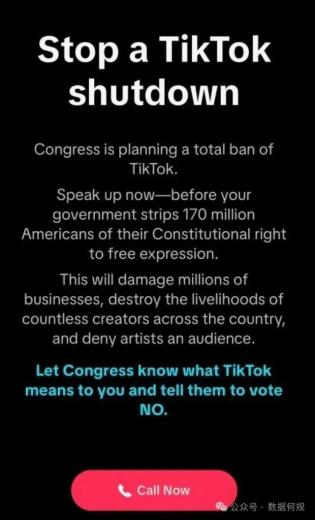在《拆分法案》公布后,TikTok并没有坐以待毙,而是发起反击:给超过1.7 亿的美国用户弹窗,引导他们给国会议员打电话,要求国会撤销关停Tiktok的议案。TikTok拥有约1.7亿美国用户,其命运已成为美国政府的一个焦点,立法者被TikTok用户反对该立法的电话淹没。TikTok首席执行官周寿称,如果该法案成为法律,将产生可怕的后果,预计禁令将对创作者和小企业产生重大影响。尽管存在政治分歧,但随着对在美国运营的中国拥有的科技平台的审查力度加大,主流情绪越来越支持该法案。