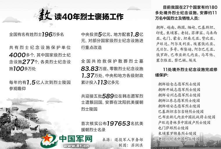 2013年起,有关部门多次组织志愿军老战士和烈士家属赴朝祭扫志愿军先烈。抗战胜利70周年之际,首次以国家名义赴马来西亚、菲律宾、巴布亚新几内亚祭扫抗战英烈。中朝双方隆重举行开城、安州志愿军烈士陵园竣工仪式。中国和老挝共同举行在老挝中国烈士陵园修缮工程竣工仪式。一系列重大专项活动的顺利实施,彰显了国家尊重烈士的大国形象,赢得社会各界广泛赞誉。