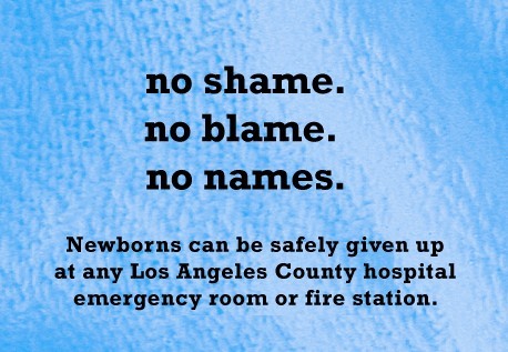 “不用感到羞耻,不会受到责罚,不需留下名字。你可以到洛杉矶郡的任意医院急救室或消防站安全弃婴。”——美国加州洛杉矶郡“安全交出”计划宣传语。
