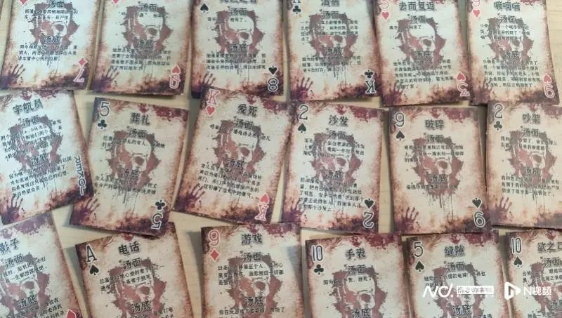 由舒女士提供的图片可见,一张张如扑克牌大小的卡牌上,写着“汤面”“汤底”,“汤面”为谜面,“汤底”则是谜底。譬如,其中一张卡牌的“汤面”写道:“母亲打了一通电话杀死了女儿”;当出题者讲出上述情境后,其余玩家需推理出这句话背后讲述了怎样的故事。