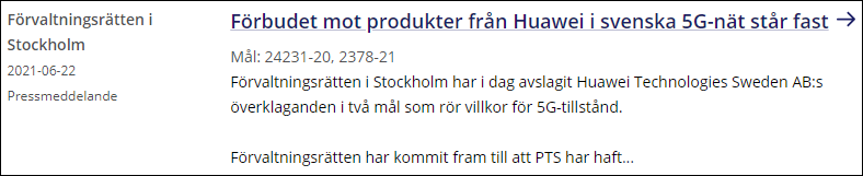 【文/观察者网 熊超然】去年10月,华为被瑞典政府禁止参与5G频谱拍卖活动,对于这项不公决定,华为公司提起了上诉。当地时间6月22日,斯德哥尔摩行政法院对此案作出判决,驳回华为上诉,判定瑞典政府的决定并不违法,即维持了这项“华为5G禁令”。