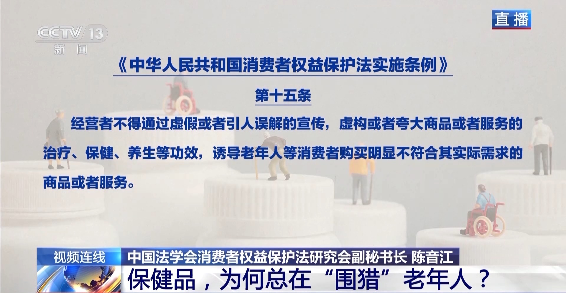 中国法学会消费者权益保护法研究会副秘书长 陈音江:这一次的专项整治,针对传统的线下“免费讲座”“专家义诊”等进行销售保健品和药品的现象,作为专项整治的重点内容。同时也把线上通过网络直播,包括微信账号,以健康养生的形式,推荐药品和保健品的行为,也列为一个重点整治的内容。针对性非常强,现在很多老年人喜欢刷手机,又有时间。在刷视频的时候,老年人确实有健康知识的需求,表面上是看健康知识,学习相关的消费常识,但是有一些不良商家,趁机销售假冒伪劣的产品,或者非常有针对性地销售一些保健品或者药品。