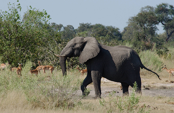 博茨瓦纳是南部非洲内陆国家,其中部和北部地区属于卡拉哈里荒漠北缘,奥卡万戈三角洲和乔贝河则是整片连续干旱区中难得一见的局部丰水区。低矮的灌木遍布于密集的水道边,大象、河马、水牛、黑斑羚等随处可见,那里是野生动物的天堂。