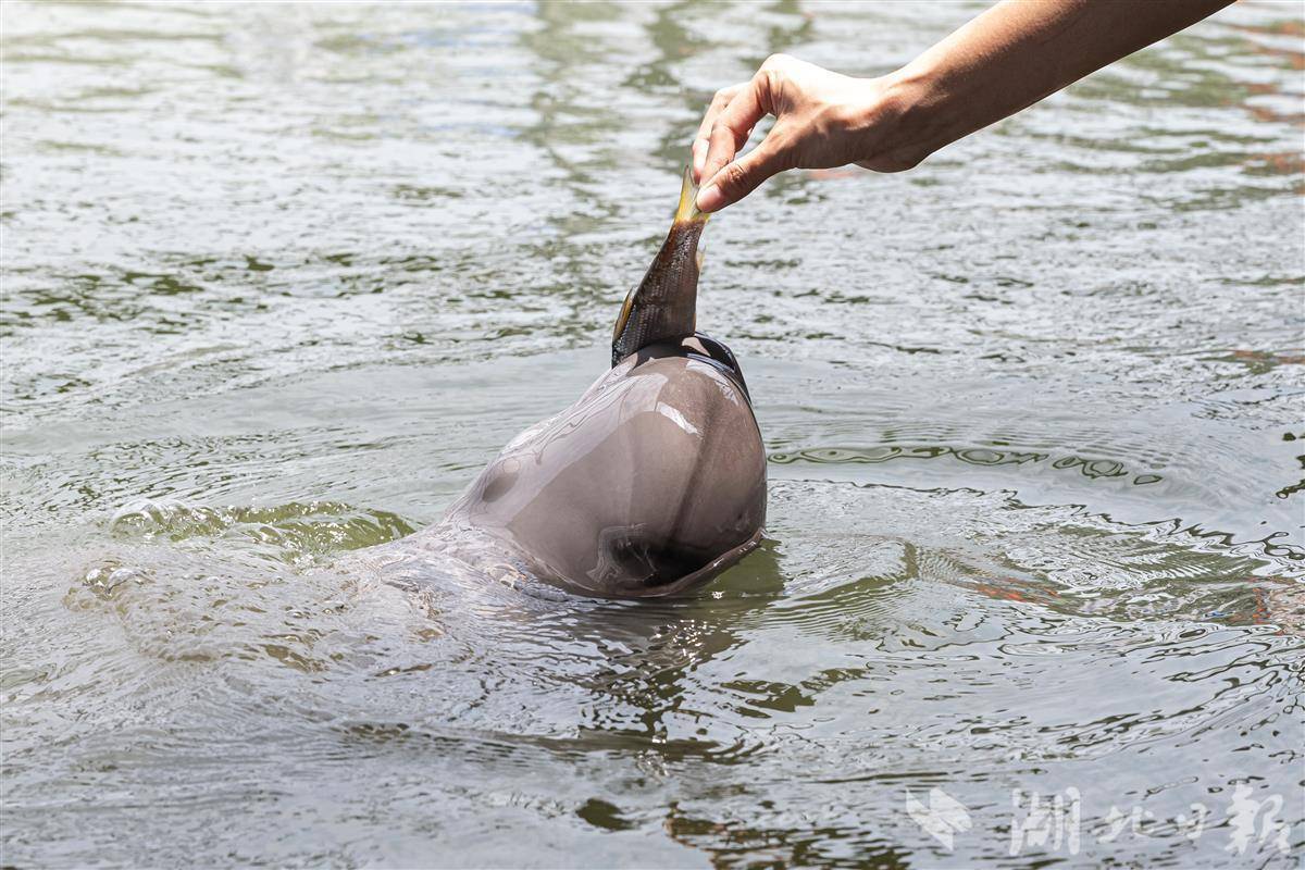 6月5日,来自柬埔寨、印度尼西亚、老挝、越南、泰国等国家的代表和技术官员来到湖北石首的长江天鹅洲白鱀豚国家级自然保护区,体验喂食江豚。(湖北日报全媒记者任勇摄)