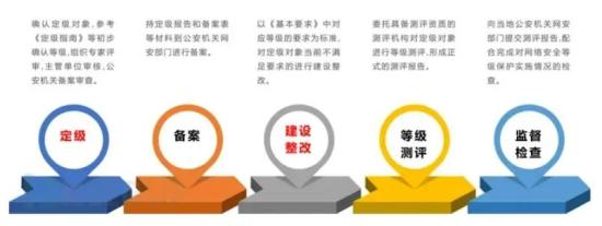 根据网络安全等级保护相关标准,等级保护工作总共分五个阶段,分别为:系统定级、系统备案、系统安全建设、系统等级测评、监管单位定期监督检查。