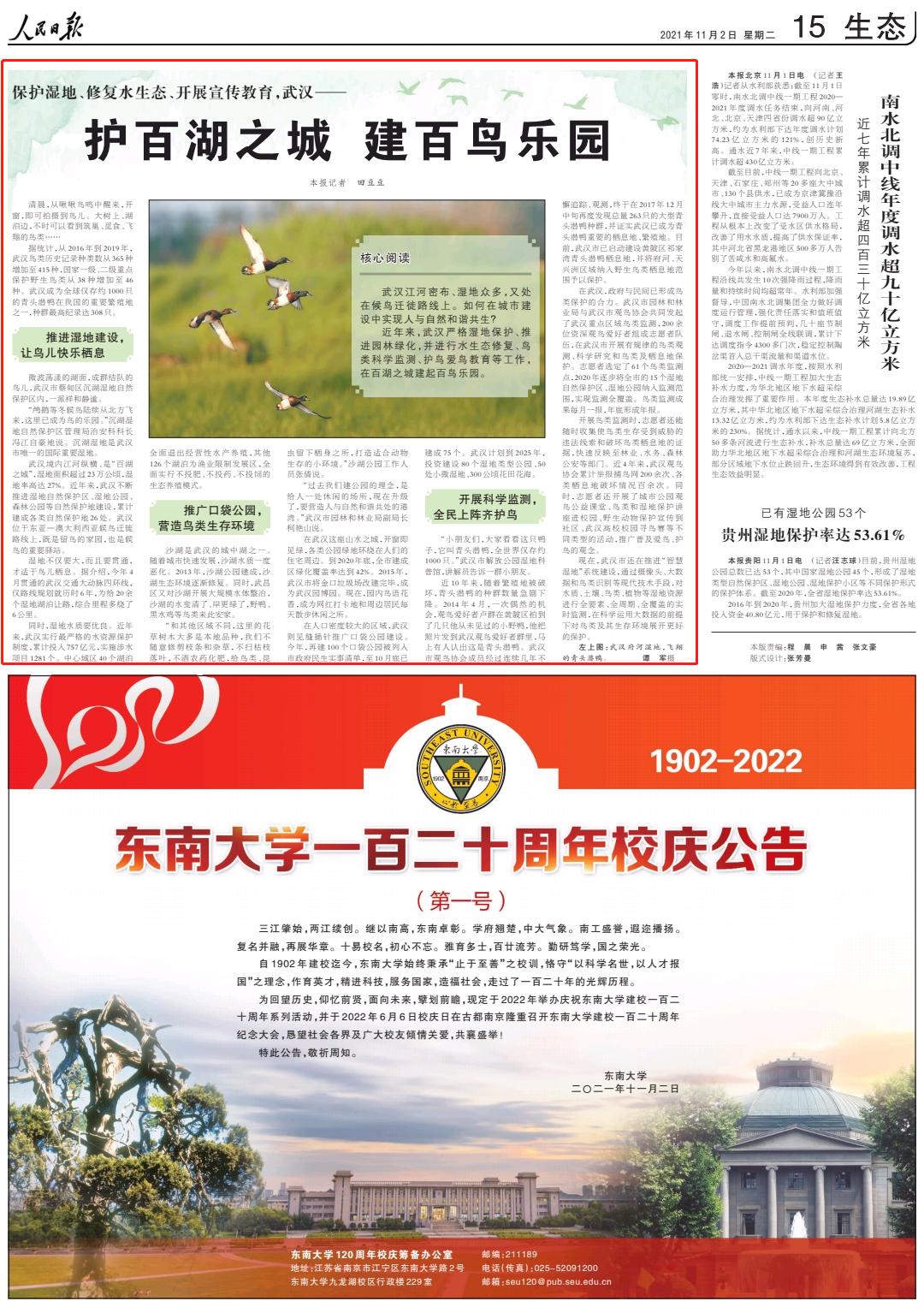 《人民日报》2021年11月2日15版刊发报道,介绍了武汉保护湿地、修复水生态、开展宣传教育等相关情况。报道全文如下——