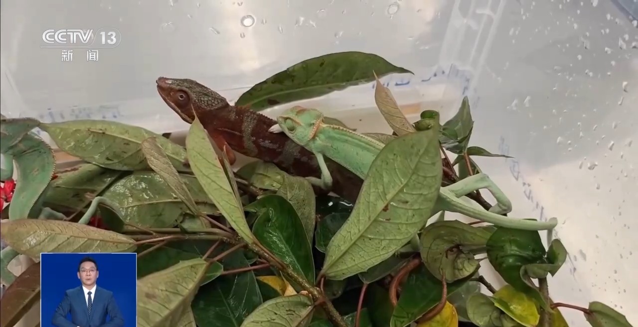 深圳海关所属皇岗海关关员 刘芊华:这名旅客衣着臃肿、身体僵硬、神情比较紧张,我们就对他进行了拦截检查。结果在他的腰部两侧和后背处发现透明塑料袋,袋中装有10只濒危变色龙、4只外来物种伞蜥、1只卵胎蜥属物种。