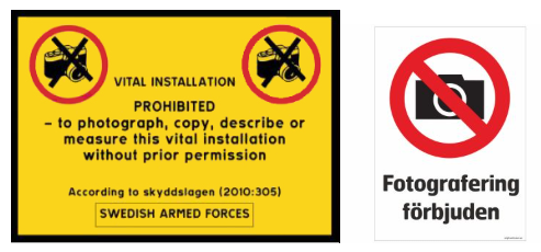 三、避免违规拍照。近期,多位中国公民因无意间拍照而触犯当地法律法规,面临严重后果。在此,我馆郑重提醒来瑞中国游客,请留意当地禁止拍照、禁止进入等标识(包括但不限于下图所示),请勿在军事设施、机场海关等要地及其周边拍照。如拟使用无人机,请提前了解相关规定并办妥许可。