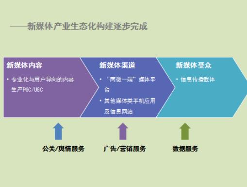 2.新兴媒体产业生态化构建逐步完成。新媒体产业逐步完善,生态化产业全景逐步搭建。在新兴媒体内容端,由传统新媒体、政务新媒体、地方媒体、企业新媒体以及自媒体组成了多样化的生态圈,专业化内容生产模式(PGC)与用户导向的内容生产模式(UGC)相互协同、相互补充。在新媒体渠道端,形成了“两微一端”为代表的新媒体平台、浏览器应用、视频直播、VR媒体平台等多样化的新兴媒体入口,网民可以在智能手机通过不同渠道获取多样化的新闻资讯内容。与此同时,产业链条逐步延伸,广告服务、数据服务、公关服务等衍生服务快速兴起,在社会化营销及渠道推广等衍生服务领域逐步完善新媒体产业发展。
