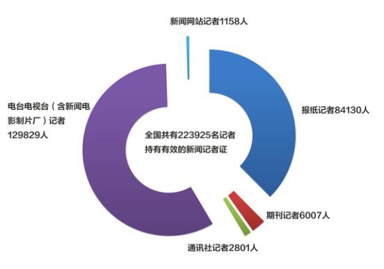 截至2016年底,全国共有223925名记者持有有效的新闻记者证,其中报纸记者84130人,期刊记者6007人,通讯社记者2801人,电台、电视台和新闻电影制片厂记者129829人,新闻网站记者1158人。