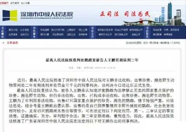 近日,最高人民法院核准了“鹦鹉案”的二审判决。图片来源:广东省深圳市中级人民法院网站 法官回应 出售驯养繁殖的珍贵濒危野生动物可从宽处罚