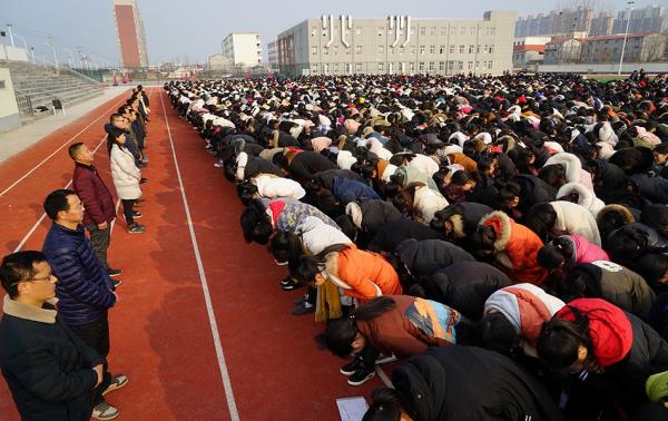 2019年2月27日,河南省汝南高中举行新学期开学典礼暨高考百日冲刺誓师大会,高三学子向辛苦教育他们的老师鞠躬,表达拜谢师恩。 视觉中国 图