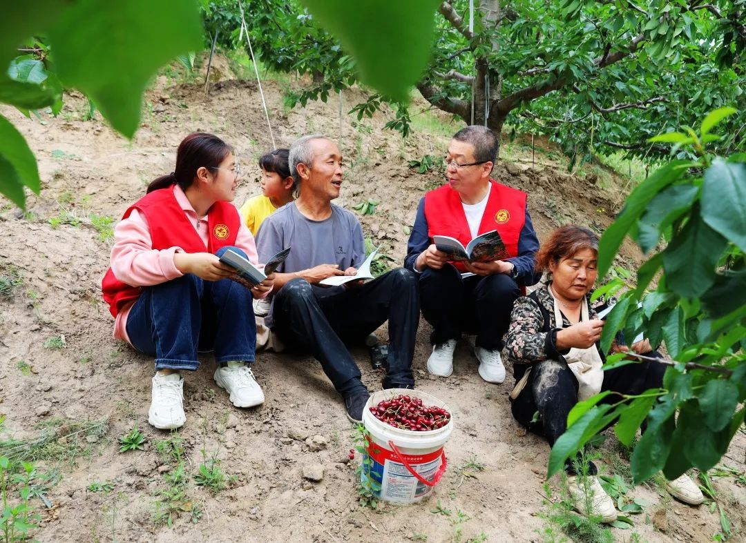 在花牛镇安家坪村樱桃园,劳作的果农席地休息,工作人员向果农宣传民法典、防范电信网络诈骗等法律知识,提高果农的法律意识,让果农们知法、守法、用法,依法维护自己的合法权益。针对果农关心的土地承包经营权流转、农资采购合同纠纷等问题以及果商关注的产品质量标准、商标注册与保护等问题,工作人员用通俗易懂的语言进行详细解答,并结合实际案例进行深入分析,让法律知识更加生动易懂。