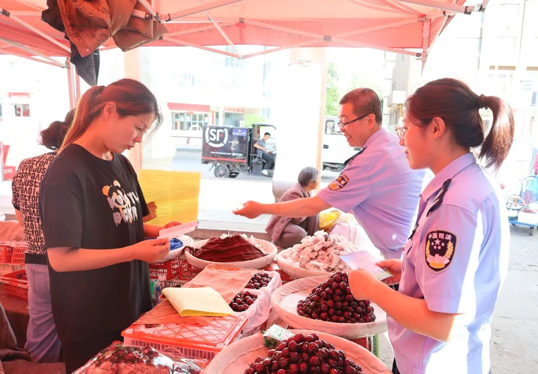 在樱桃交易市场内,帐篷林立,车流穿梭。工作人员为忙碌的摊贩递上法律宣传手册,重点宣传《中华人民共和国民法典》中关于合同签订与履行、侵权责任等方面的规定,以及《中华人民共和国消费者权益保护法》《中华人民共和国农产品质量安全法》等法律法规,为商贩提供法律咨询和服务,确保樱桃交易的公平、公正。一位忙着打包礼盒的商户感叹:“生意火爆咨询多,这份手册真是及时雨,学了法律心里更有底!”