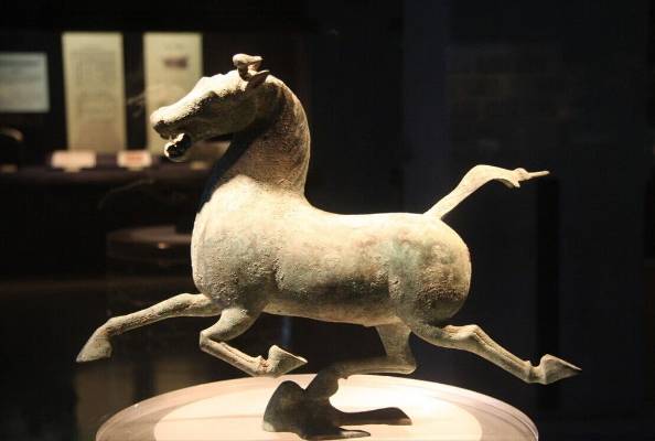 铜奔马,又称马踏飞燕,东汉时期文物。1969年出土于甘肃省武威市雷台汉墓,现藏甘肃省博物馆。“马踏飞燕”身高34.5厘米,身长45厘米,宽13厘米,自出土以来一直被视为中国古代高超铸造业的象征,马踏飞燕也是中国青铜艺术的奇葩。