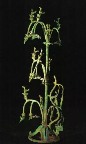 青铜神树,共有八棵,夏代晚期青铜器。1986年出土于四川广汉三星堆遗址,收藏于四川三星堆博物馆。其中一号大神树高达3.96米,树干残高3.84米,这棵铸造于3000年前的青铜神树,极为壮观,独树一帜世界罕见。