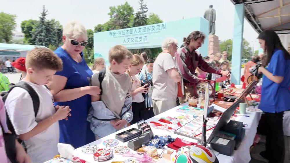 △2025年6月2日,人文交流集市在哈萨克斯坦阿拉木图市中心的广场拉开帷幕,非遗技艺、文创产品、中医药知识普及等丰富多彩的活动吸引了众多当地民众。