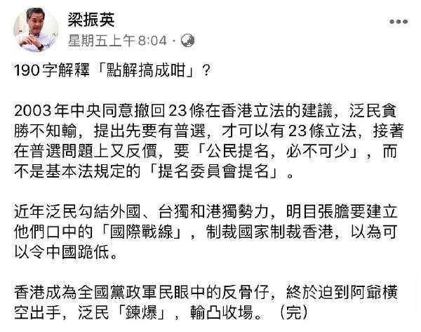 梁振英在facebook上贴文指出:2003年时,中央同意撤回23条在香港立法的建议,但反对派却贪心不足,近年又勾结外国、“台独”和“港独”势力,明目张胆要建立他们口中的“国际战线”,制裁国家制裁香港,最终令香港成为全国人民眼中的“反骨仔”,终于逼到中央横空出手,反对派满盘皆输。