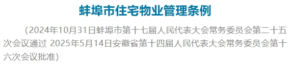 安徽省第十四届人民代表大会常务委员会第十六次会议审查了《蚌埠市住宅物业管理条例》,决定予以批准,由蚌埠市人民代表大会常务委员会公布施行。