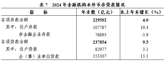 年末全部金融机构本外币各项存款余额229502亿元,比上年末增长4.0%,其中人民币存款余额增长4.0%。住户本外币存款余额107787亿元,增长10.4%。全部金融机构本外币各项贷款余额237854亿元,增长9.5%,其中人民币贷款余额增长9.7%。年末主要农村金融机构(农村信用社、农村合作银行、农村商业银行)人民币贷款余额37815亿元,比年初增加3768亿元。