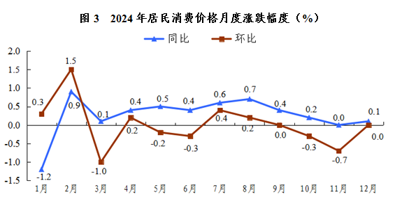 全年居民消费价格比上年上涨0.3%。其中,城市上涨0.2%,农村上涨0.3%;消费品价格持平,服务价格上涨0.6%。工业生产者出厂价格下降2.2%,工业生产者购进价格下降2.4%。