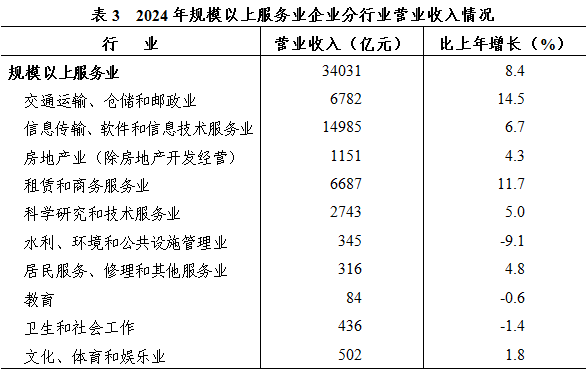 [6]规模以上服务业统计范围包括:年营业收入2000万元及以上的交通运输、仓储和邮政业,信息传输、软件和信息技术服务业,水利、环境和公共设施管理业,卫生行业法人单位;年营业收入1000万元及以上的房地产业(不含房地产开发经营),租赁和商务服务业,科学研究和技术服务业,教育行业法人单位;以及年营业收入500万元及以上的居民服务、修理和其他服务业,文化、体育和娱乐业,社会工作行业法人单位。