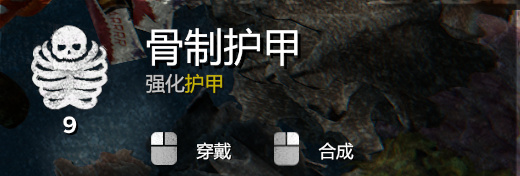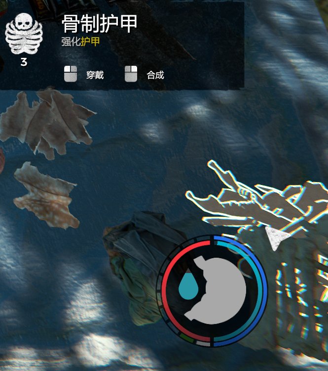 骨甲是由六个骨头加三个布合成,打死的野人不要丢弃,造个小火堆把几个死野人丢上去,过一会没用的野人就能变成一堆骨头。骨甲是森林中最常用但防御力不是最高的,别的甲待会会在战斗部分讲。
