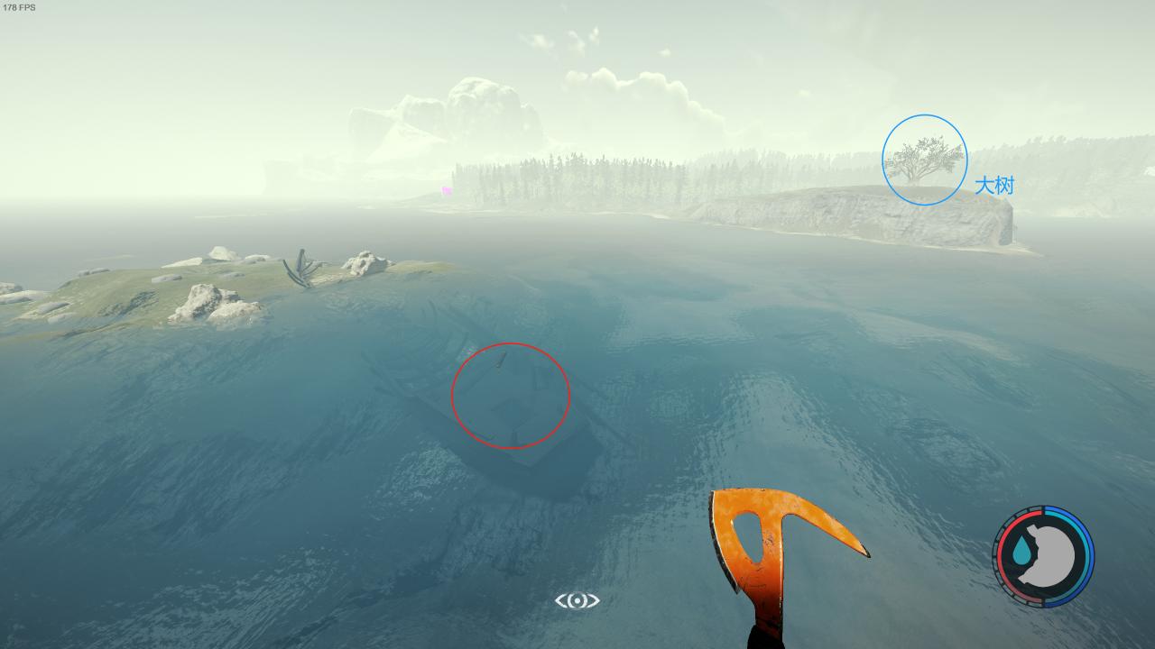 教堂图纸与十字弩洞:同样位于海底需要潜水器,在地图西南角,大树的西方向,海面漂浮有木板,底下是沉船,如下图。