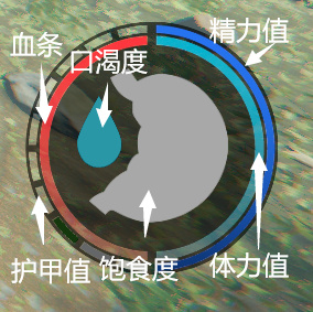 说一下人物状态指示,小方格为护甲值,一个甲占一个格。红色为生命值,水滴为口渴度,胃图标为饱食度。浅蓝靠内的条为体力值,像跑步挥砍格挡这类动作消耗体力值。靠外深蓝为精力值,精力值的作用就是决定体力值的上限,假设精力只有10点那么体力最多回到10点,可以从坐椅子,喝苏打水等方式补充。