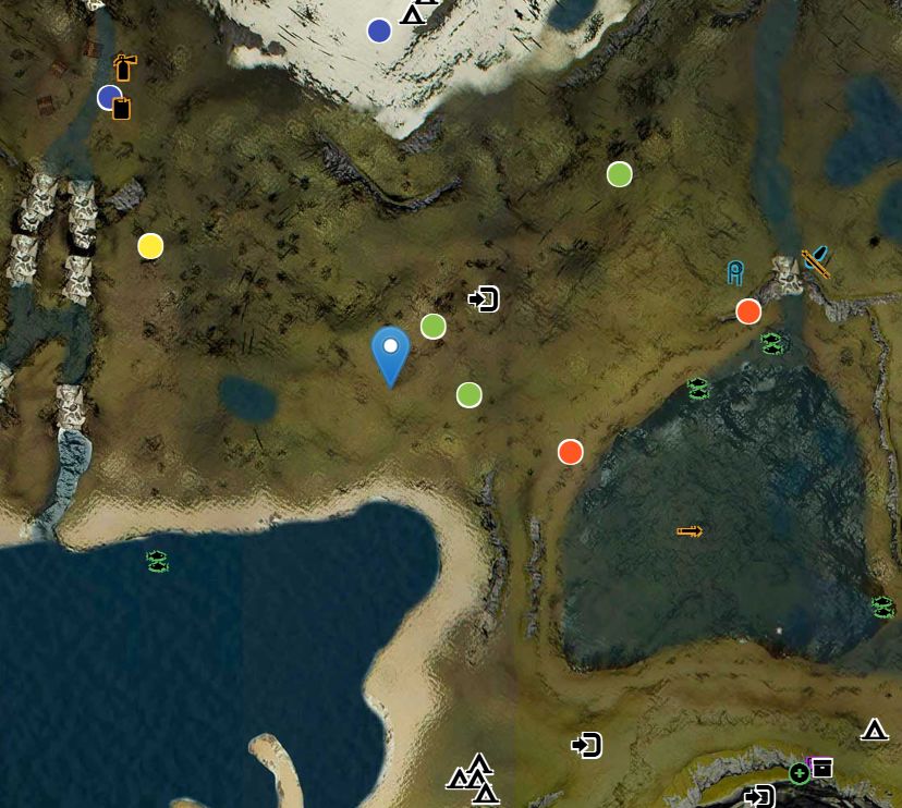 位置三:靠北边的陆地,适合玩过森林的老鸟,这附近容易刷野人和鳄鱼需注意。绿点为陆龟,黄点为野猪,野猪是很重要的资源。