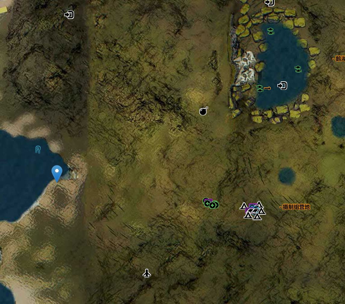 位置一:稿主最喜欢的位置,靠海地形开阔,每天都有源源不断的海龟爬上岸,根本不缺食物。在这附近有一个出生点位(图上飞机位置不准确,应该在炸弹标志那旁边),在出生点位旁有摄制组营地,摄制组营地每天都会刷大量现代箭,打起来比自制箭手感好不少。
