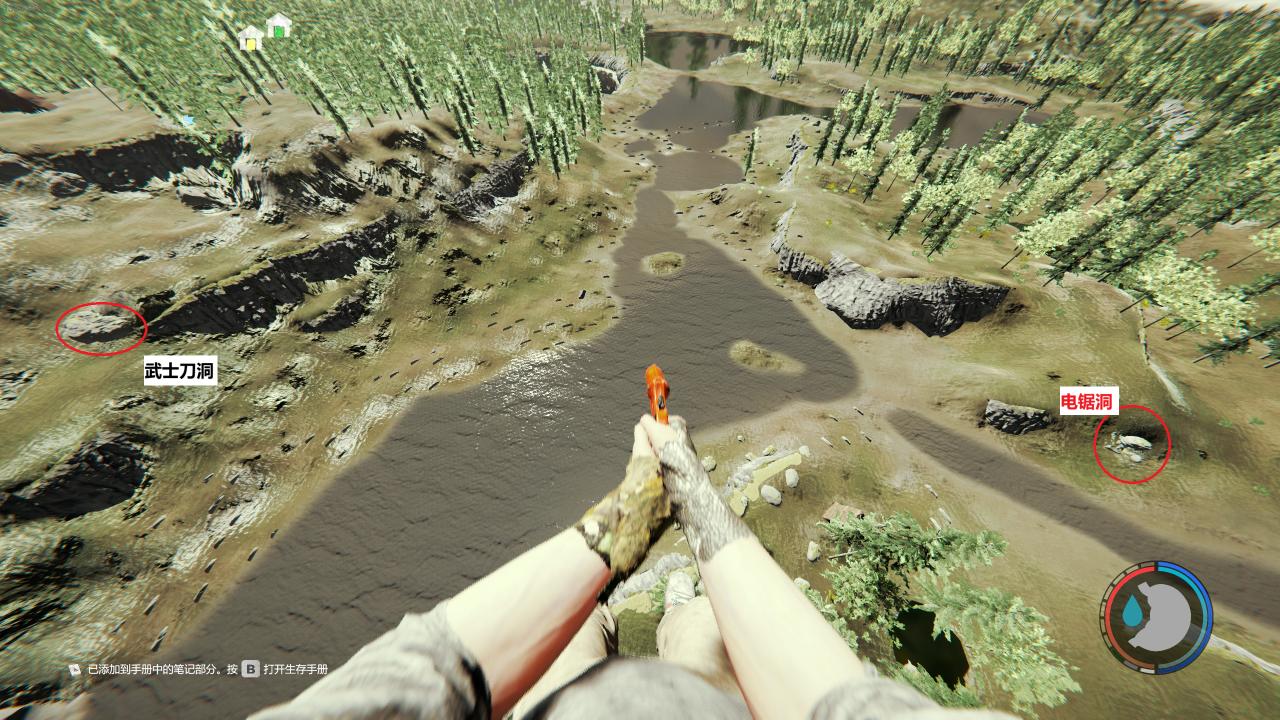 电锯洞:建议先拿电锯顺手把登山镐拿了,俩挨一块的。洞口位于武士刀洞口东北方向。