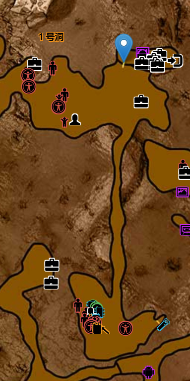 蓝点为浣熊,黄点为野猪,飞机为出生点,炸弹为火枪零件,门为洞口。图1