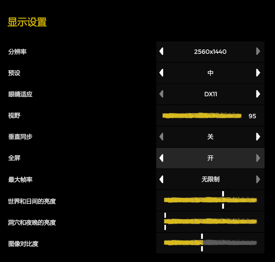 首先是设置,推荐视野拉满,拉满后可以多获取信息并且会让你产生人跑的快感觉,这个看个人喜爱。其次是“世界日间亮度”和“洞穴夜晚亮度”这两项建议拉满,世界那个看个人,在地面白天觉得亮可以拉低点,洞穴那个一定要拉满玩起来会舒服很多很多。