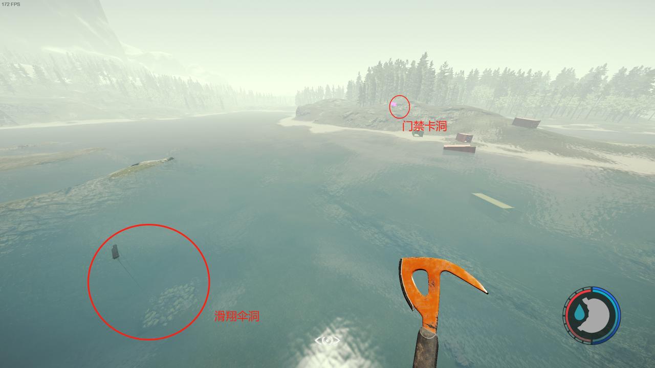 滑翔伞与高塔图纸洞:位于海底需要潜水器,在门禁卡洞的西方向,在海面有块漂浮木板,可看下图。